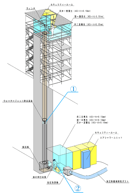 ①封じ込め作業時以外は、煙突の稼働を停めずにアスベスト処理が可能。