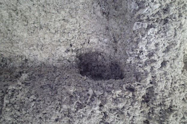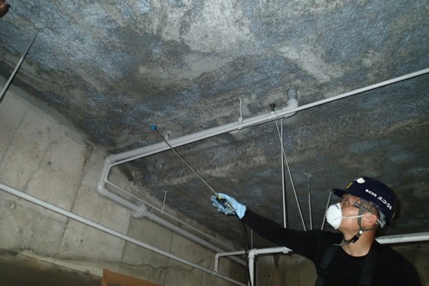駐車場や店舗の天井・梁などで多く見かける「ロックウール」と呼ばれる建物の耐火材として用いる被覆材が、経年劣化や鳥害の影響によりロックウールが剥離し、地面に落下してしまうことが多々あります。